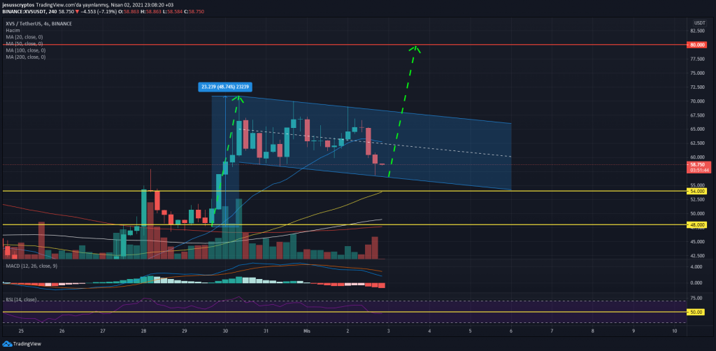 Günlük grafiğin yanı sıra 4 saatlik zaman diliminde XVS grafiğine bakıldığında fiyatın %50’ye yakın yükselişinin ardından bir paralel kanal oluşumu görülüyor. Bu paralel kanal ve yükseliş mumlarına bakıldığındaysa XVS fiyatının 80 doları hedefleyen bir boğa bayrağı oluşturduğu düşünülüyor.