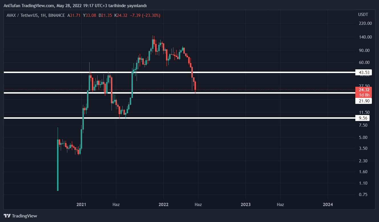 İlerleyen haftalarda 21 dolar desteğini kaybetmemesi gereken AVAX, bu destek altı kapanışlarda ise 10 dolar seviyelerine kadar düşüş yaşayabilir.