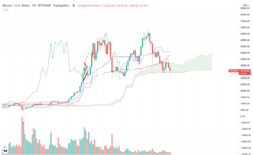 Haftalık Bitcoin grafiğine göre ise 100 haftalık hareketli ortalama şu an destek konumunda ve bunun altına inilmesi bir hayli zorlu gözüküyor.