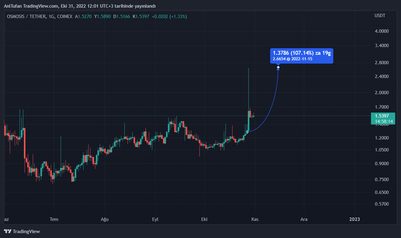 Binance cephesinden gelen bu listelemenin ardından sonra Osmosis (OSMO) isimli altcoin’in kısa bir süre içerisinde yüzde 100’den fazla yükseliş yaşayarak değerini 2’ye katladığı görülebiliyor.