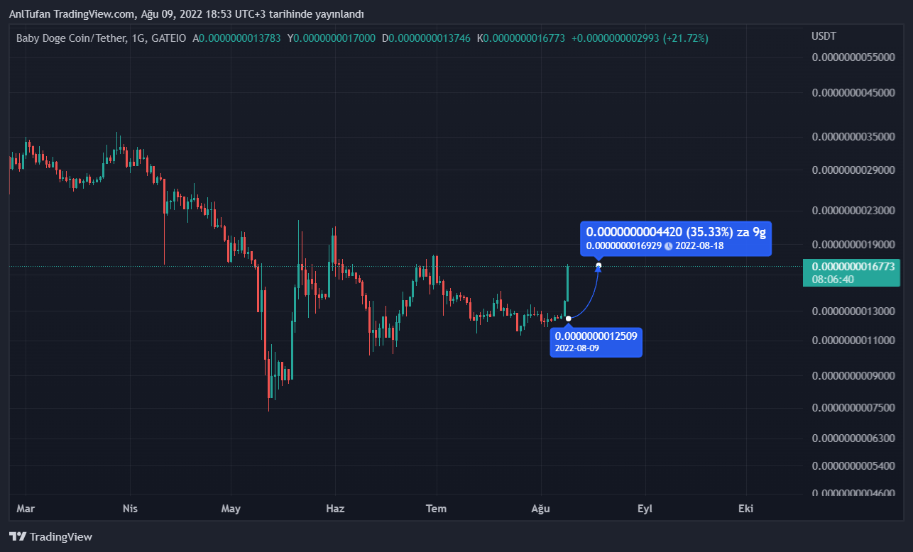 Dün akşam itibariyle duyuru sonrası kademeli bir şekilde değer kazanan BABYDOGE, bugün özelinde ise Bitcoin‘in düşüşlerine rağmen çok daha sert bir yükseliş yaşamakta.