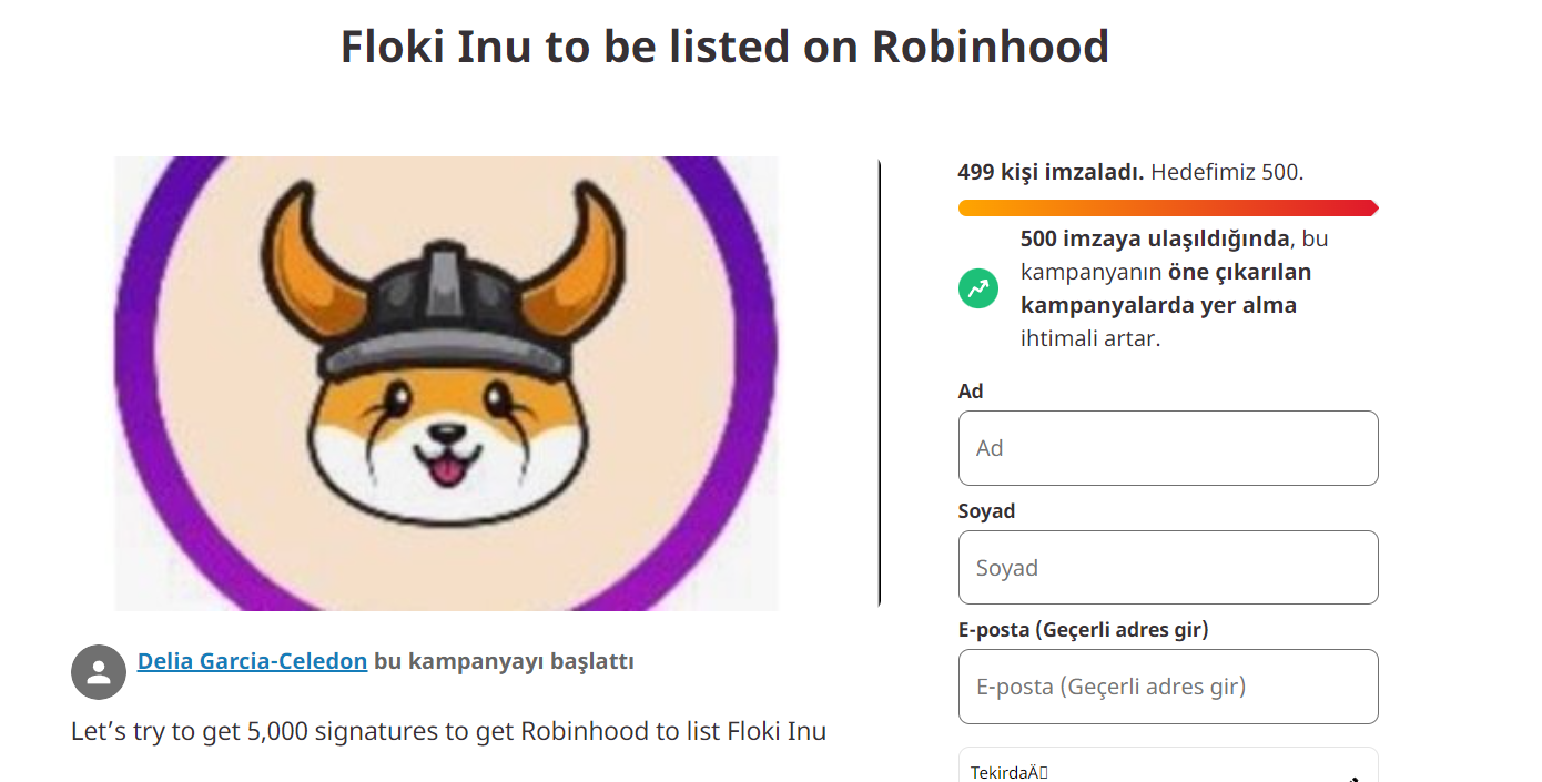 Bugün itibariyle ise bir diğer popüler meme coin olan Floki Inu, change.org web sitesi sayesinde Robinhood üzerinde listelenebilmek için bir imza kampanyası başlattı.