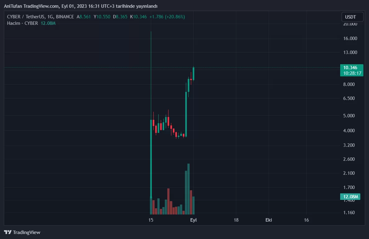 Son 24 saat içerisinde yüzde 20’lik bir yükseliş yaşayarak 10.3 dolara ulaşan CYBER, piyasadan ayrışıp yükselişlerini sürdürüyor. Bugün diğer altcoin’lerde böyle bir yükselişin olmadığı gözlemekte.