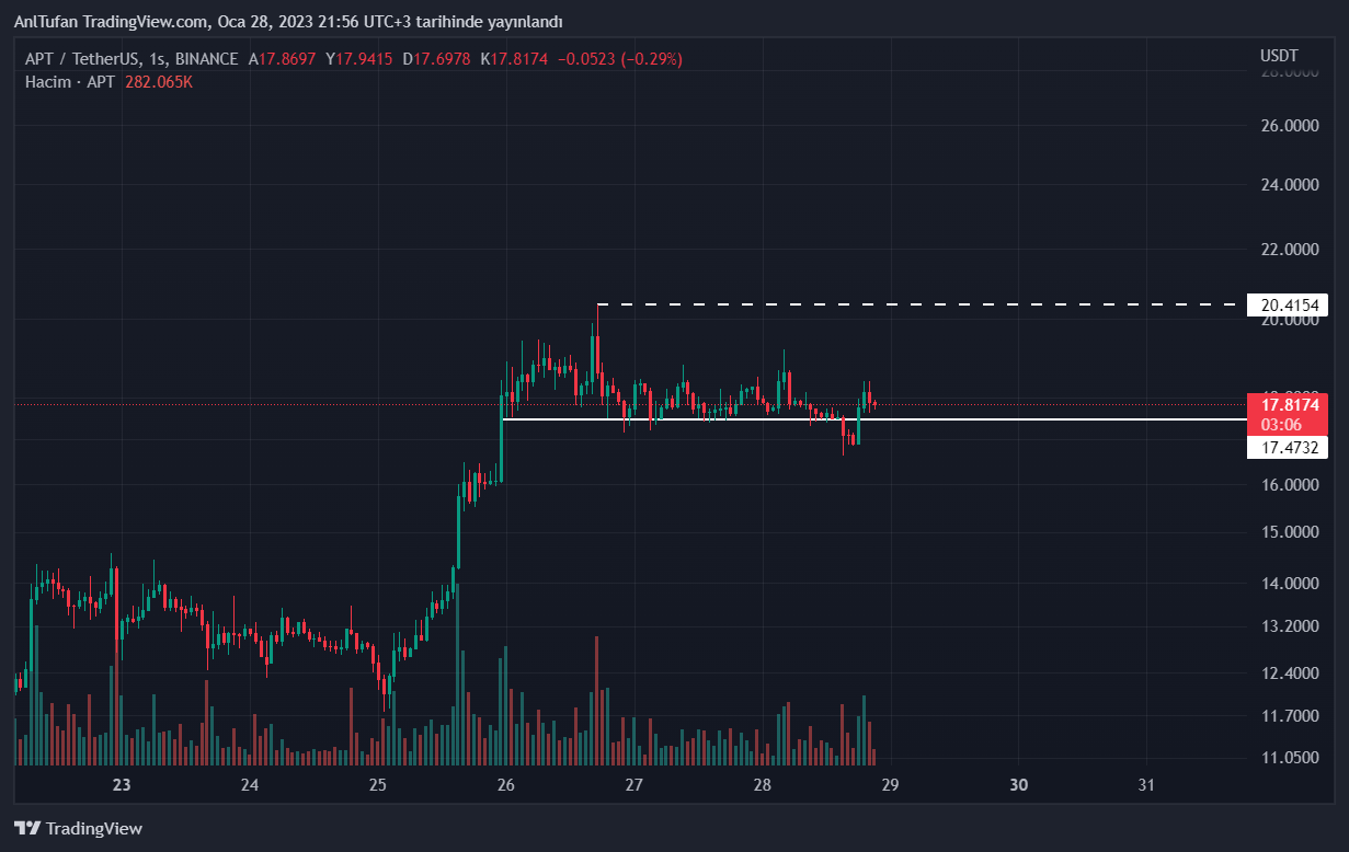 Aptos halen 20.40 dolar zirvesinin altında yer alsa da, 17.47 dolar desteğinde tutunmaya devam etmekte. İlerleyen saatlerde APT’nın tekrardan son zirve seviyelerine doğru hamleler sergilemesi bekleniyor.