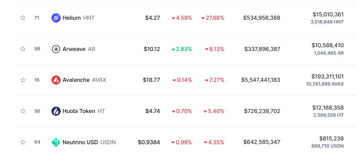 HNT’nin ardından sonra ise sırasıyla AR, AVAX, HT ve USDN gelmekte. Neutrino USD‘nin bir stablecoin olması gerekse de, şuan itibariyle 0.93 dolar seviyelerinden işlem görmesi yatırımcıları korkutuyor.