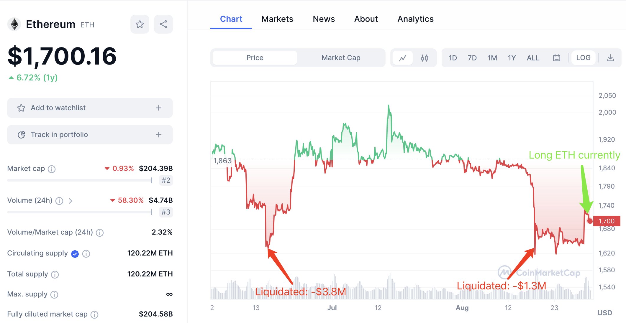 Başarılı bir veri sağlayıcısı olan Look On-Chain’in aktardıkların göre bir balina son süreçte birçok ETH long pozisyonu açsa da, likit edildi ve milyonlarca dolar kaybetti.