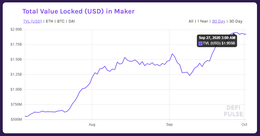 Maker has quietly grown to almost $2 billion in value locked pic.twitter.com/DId9JP443X