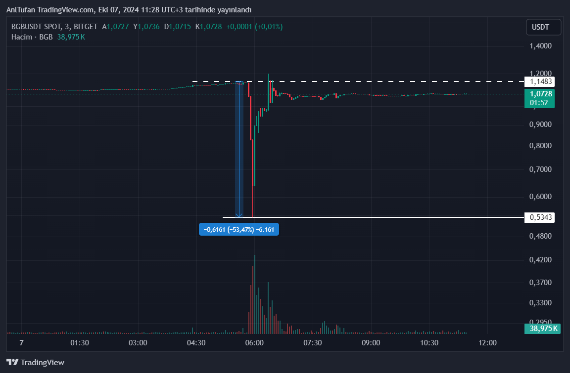 Dakikalar içerisinde 1.14 dolar seviyelerinden 0.53 dolara kadar gerileyen BGB, yatırımcıların dikkatini çekti. Sürecin ilerlemesiyle birlikte ise BGB’nin çok hızlı bir şekilde toparlandığı görüldü.