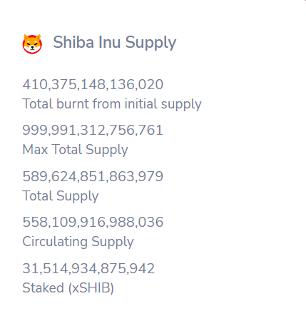 Şimdiye kadar ise 410.375.148.136.020 adet SHIB yakımı gerçekleştirildi. Yapılan yakımların haricinde ise 558.109.928.508.126 SHIB coinin belirli DeFi platformları üzerinde stake edildiği bilinmekte.