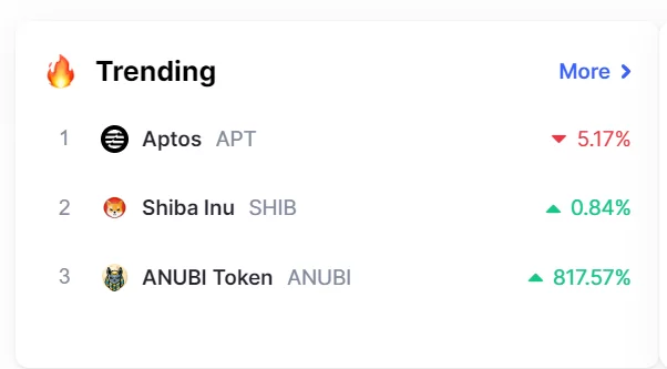 İlk sırada son dönemlerin en popüler ürünü Aptos bulunurken, 3. sırada ise sert yükseliş yaşayan ANUBI isimli bir altcoin yer almakta.