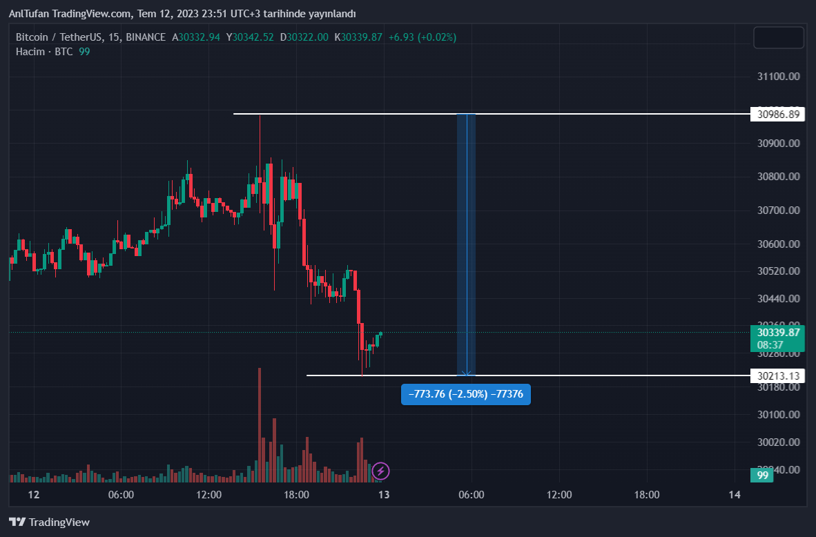 Bitcoin haberimizin yazıldığı esnada 30.300 dolar seviyelerinden işlem görüyor. Bitcoin ABD enflasyon verisi sonrasında 31 bin doları görmüş olsa da, satıcılar yine BTC üzerinde baskı kurmayı başardı.