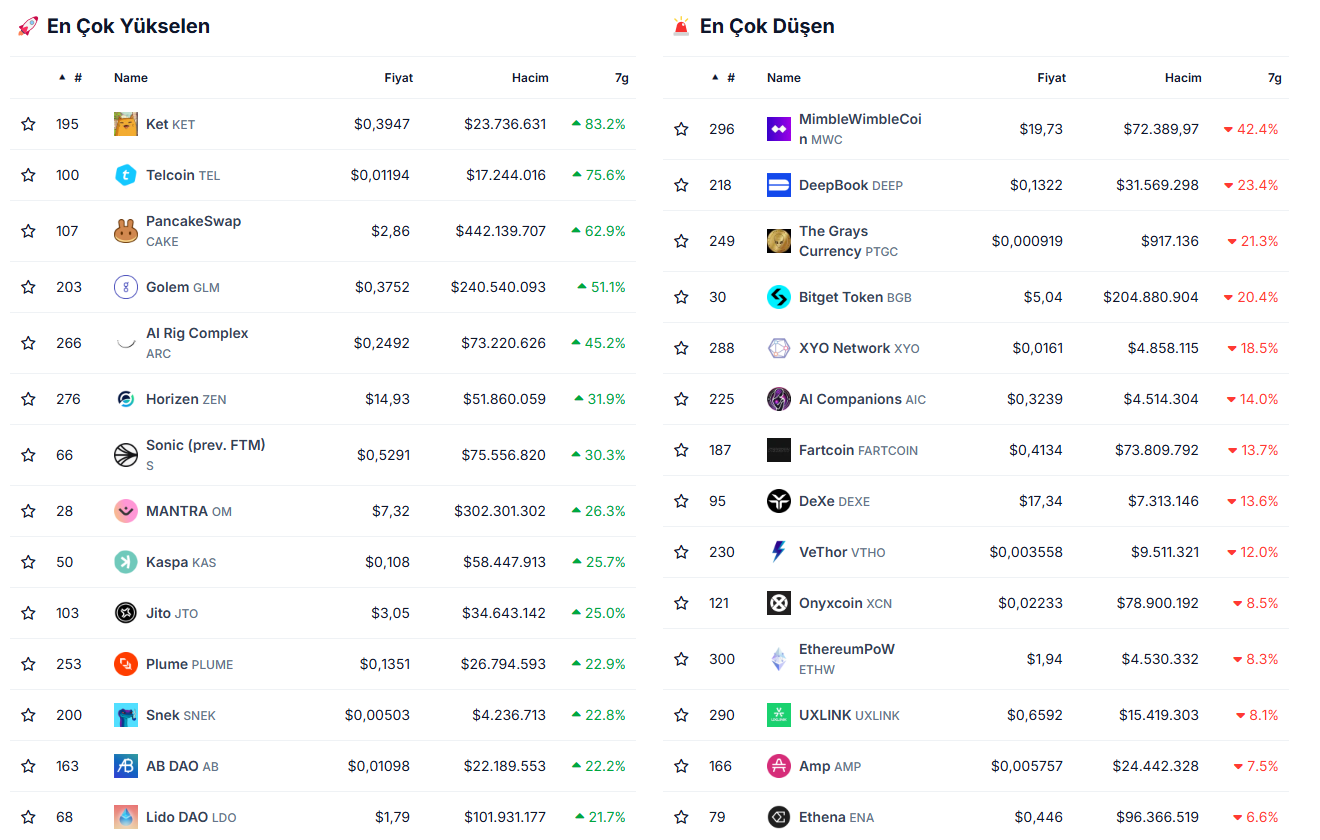 İlk 300 kripto para birimi içerisinde bu haftanın en çok yükseleni %83 ile KET oldu. KET‘in yanı sıra TEL, CAKE, GLM, ARC, ZEN ve S‘nin de %30’dan fazla değer kazandığı görüldü.
