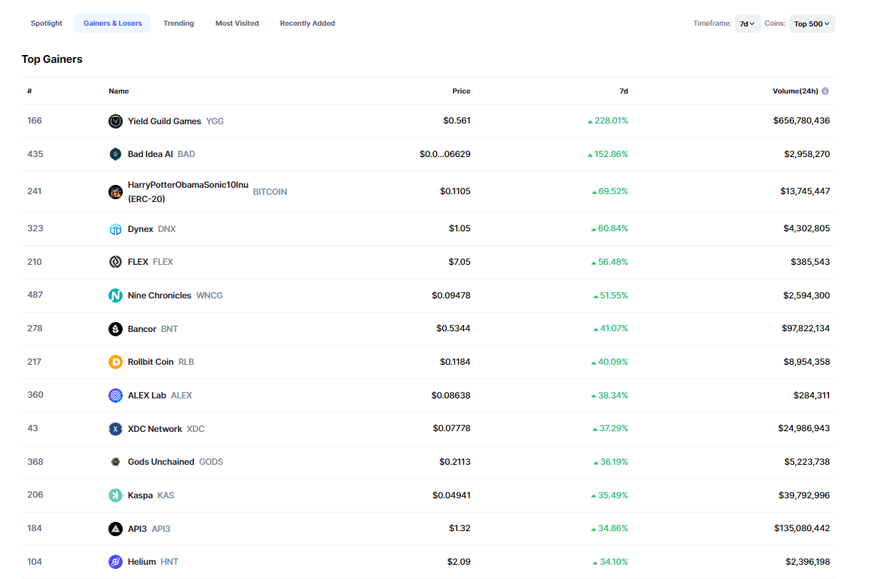 Yüzde 228 oranında değer kazanan YGG, son 7 gün içerisinde değerini 3’e katlamış gibi gözüküyor. YGG haricinde şu altcoin’lerde bu hafta yüzde 50’den fazla yükseliş yaşadı: