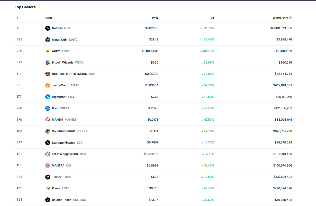 Başarılı bir veri sağlayıcısı olan CoinMarketCap‘in aktardığı bilgilere göre ilk 500 kripto para birimi içerisinde son 7 gün özelinde en büyük yükselişi Notcoin (NOT) yaşadı.