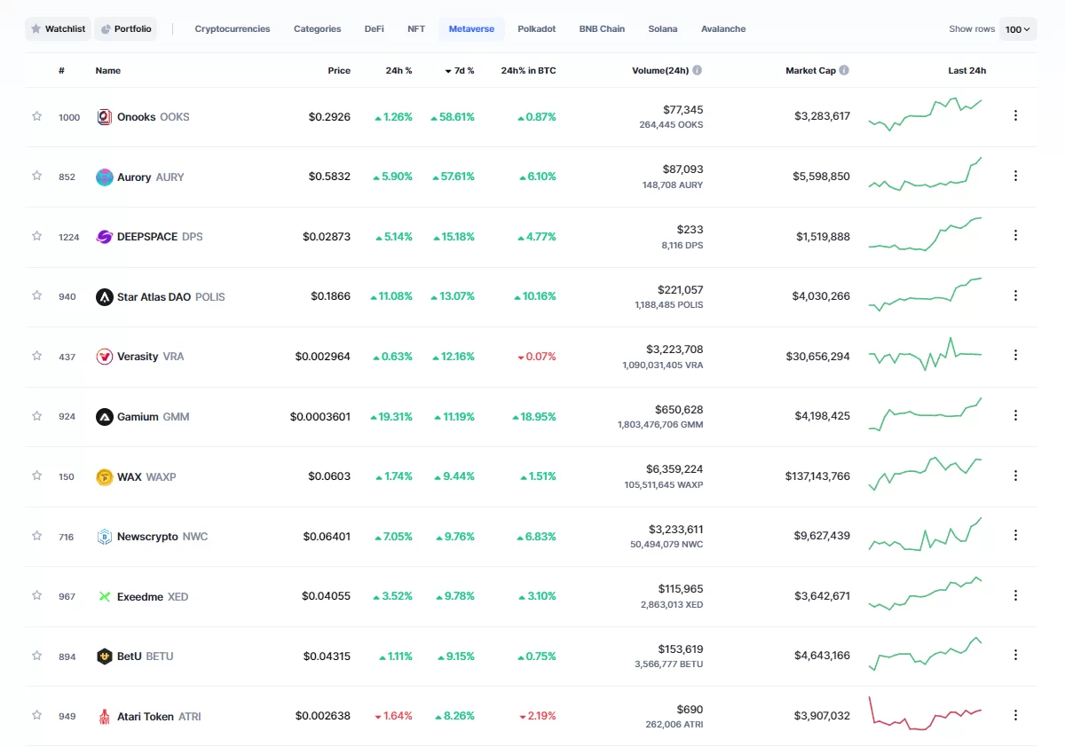 Başarılı bir veri sağlayıcısı olan CoinMarketCap’in aktardıklarına göre, aşağıda yer alan metaverse altcoin’leri bu hafta itibariyle yüzde 10’dan fazla değer kazandı: