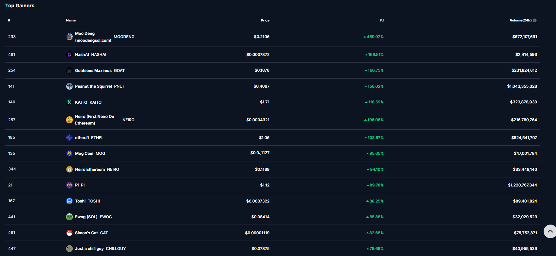 MOODENG’in yanı sıra HASHAI, GOAT, PNUT, KAITO, NEIRO ve ETHFI‘nin de bu hafta itibariyle %100’den fazla değer kazandığı görüldü.