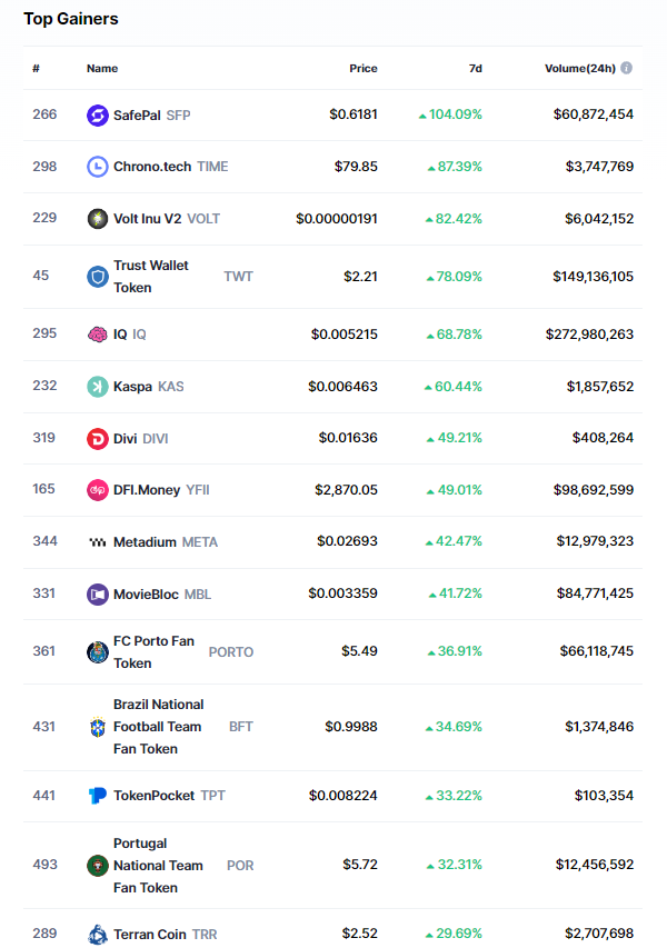 Başarılı bir veri sağlayıcısı olan CoinMarketCap’in aktardıklarına göre, ilk 500 kripto para birimi içerisinde bu hafta en fazla yükseliş yaşayan ürün SafePal (SFP) olmuş durumda.