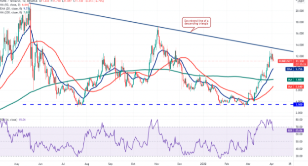 Son sırada ise THORChain (RUNE) yer almakta. RUNE, birkaç aydan beri büyük bir alçalan üçgen formasyonu oluşturmuş olsa da bunu yukarı yönlü kırdı. Şimdiki rallide ise yeni 17 dolar olarak tahmin ediliyor.