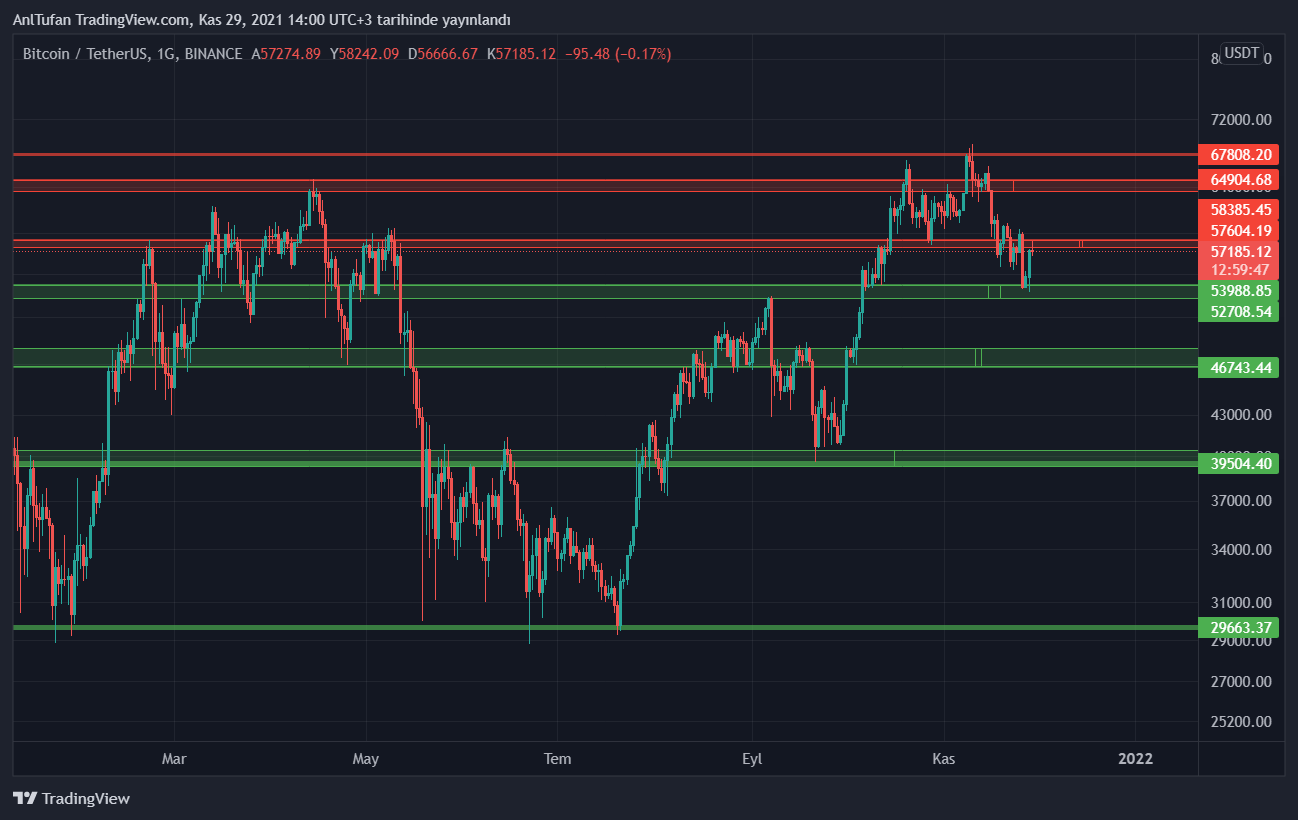 59.700 dolar seviyelerinden 53.400 dolar seviyelerine kadar gerileyen BTC, bu seviyelerden destek buldu. Destek seviyesinden yukarı doğru hareketlenen Bitcoin yayın saati itibarıyla 57.000 doları aşmış durumda.