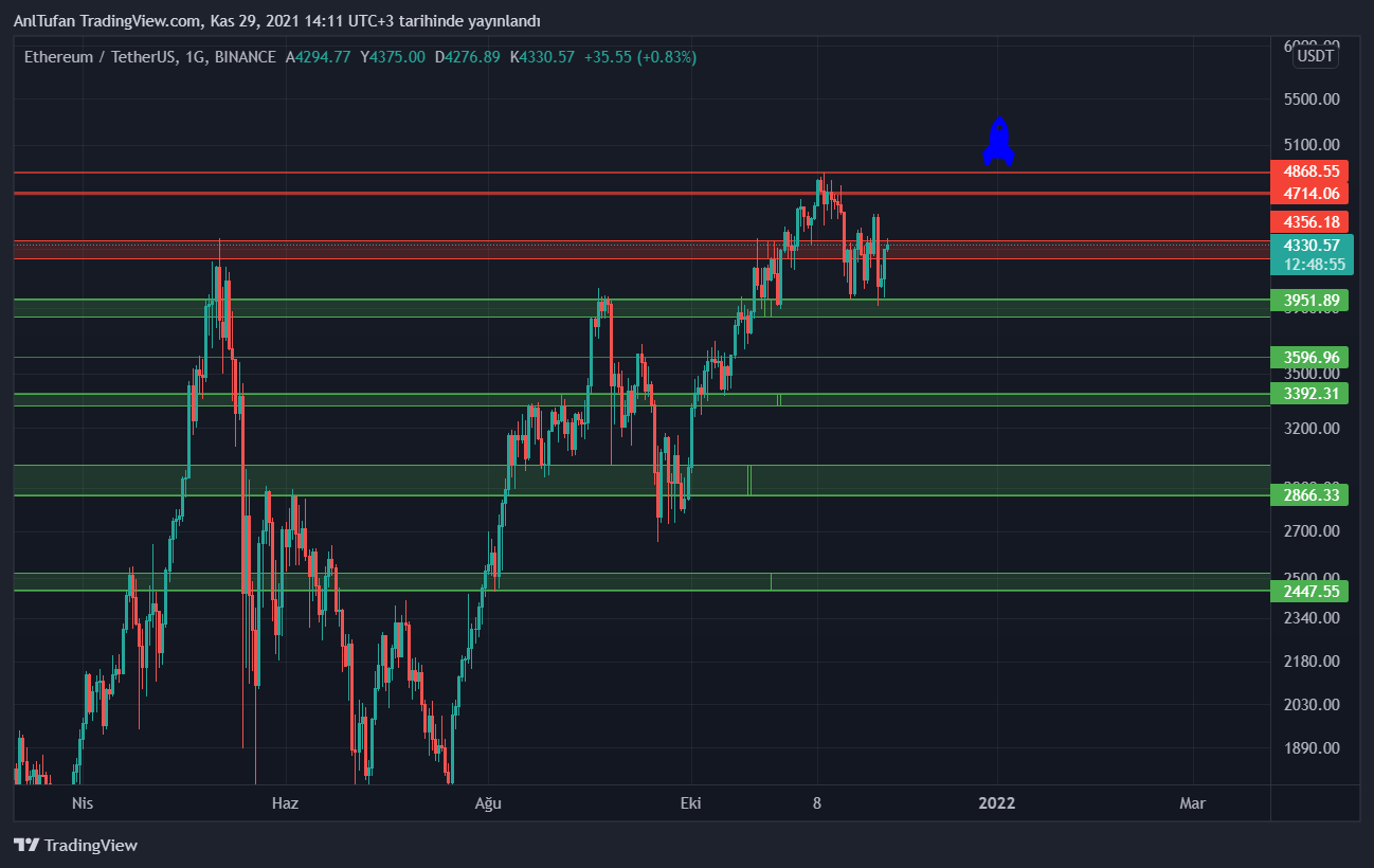Yayın saati itibariyle 4.315 dolar seviyelerinde bulunan Ethereum, 4.350 dolar direnç seviyesinde bulunuyor. Yukarıda ki grafikte gördüğünüz gibi BTC yavaş yavaş direnç den reddedilirken, Ethereum ise direnci kırmaya çalışıyor.