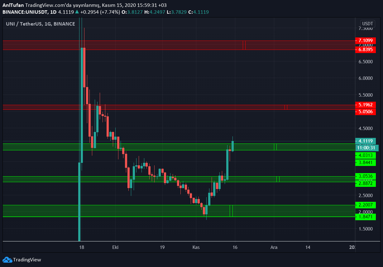Çıktığı günlerde 400 UNI coin airdropu ile gündeme gelen UniSwap son günlerde de isminden söz ettirmeyi başardı. Yatırımcısına 1 hafta içerisinde %50 yükseliş sağlayan UNI, 4 dolar direncini kırıp desteğe çevirdi ve gözünü 5 dolar direncine dikti. Ancak bu seviyeye yükseliş olmazsa 3 dolar desteğine gerilemesi bekleniyor.