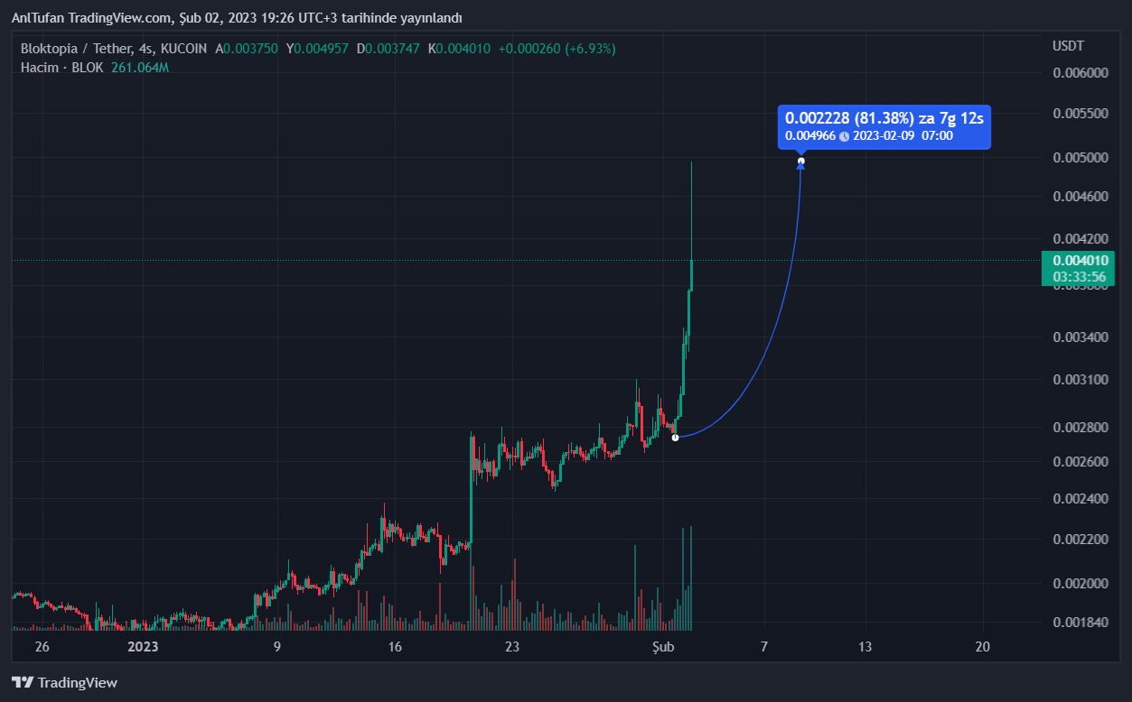 Dün geceden itibaren yükselişe başlayan BLOK, son dakikalarda 0.004960 dolar seviyelerine ulaşmış durumda. Sadece 1 gün içerisinde yüzde 80 oranında değer kazanan BLOK, her ne kadar 0.005 psikolojik direncinden şimdilik reddedilmiş olsa da, ilerleyen dakikalarda durumlar değişebilir.