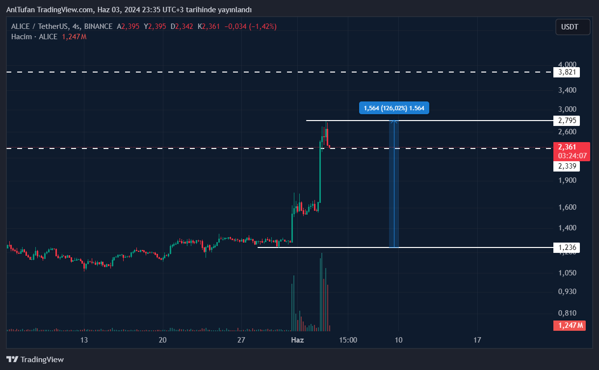 Önümüzdeki süreçte ALICE 2.34 doların altına sarkması halinde satış baskısı artabileceği gibi 2.79 dolar direncini aşması durumunda 3.82 dolar seviyelerine kadar bir yükseliş yaşayabilir.
