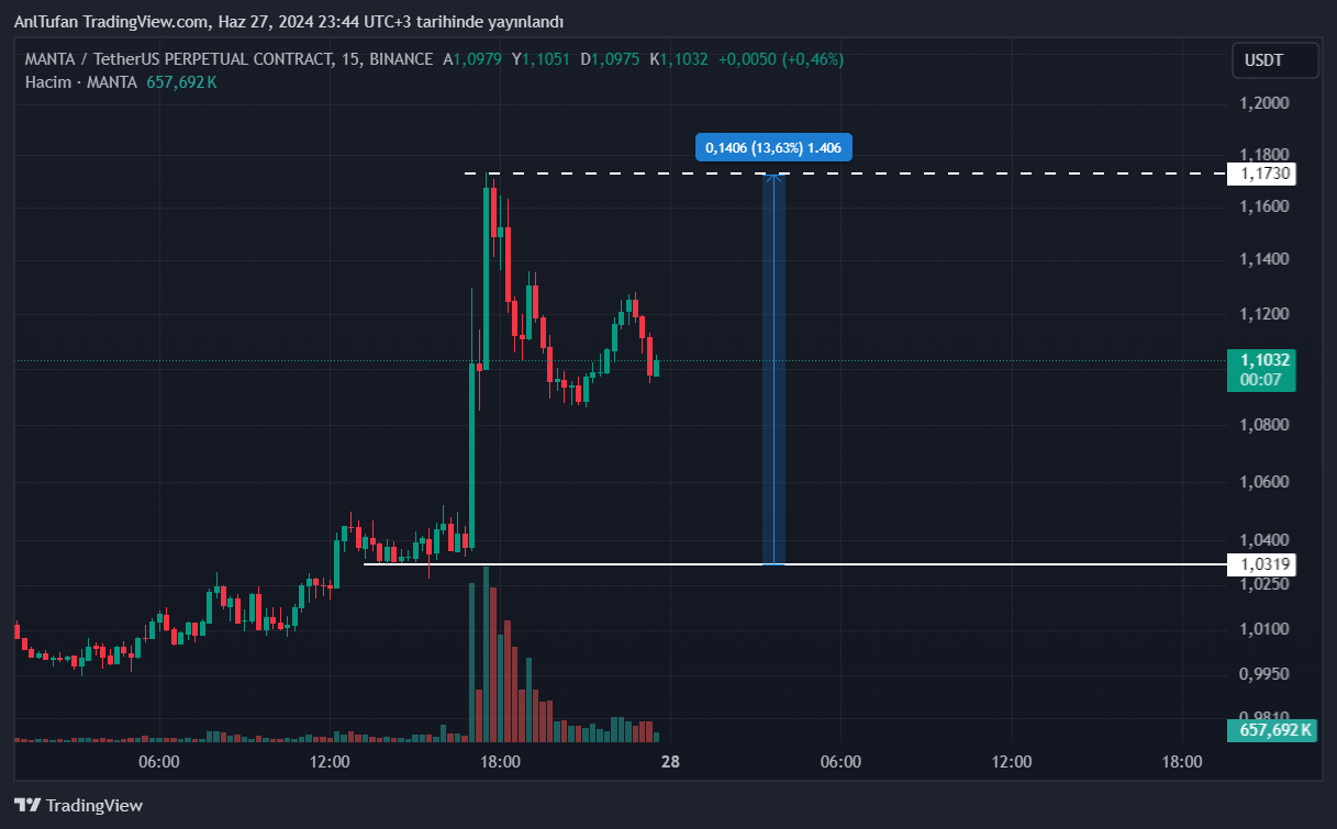 Bu gelişme ile birlikte Binance’de de listelenmiş bir altcoin olan MANTA, %13’lük bir sıçrama gerçekleştirdi. MANTA gün içerisinde 1.173 doları görse de, an itibariyle 1.10 dolardan işlem görüyor.