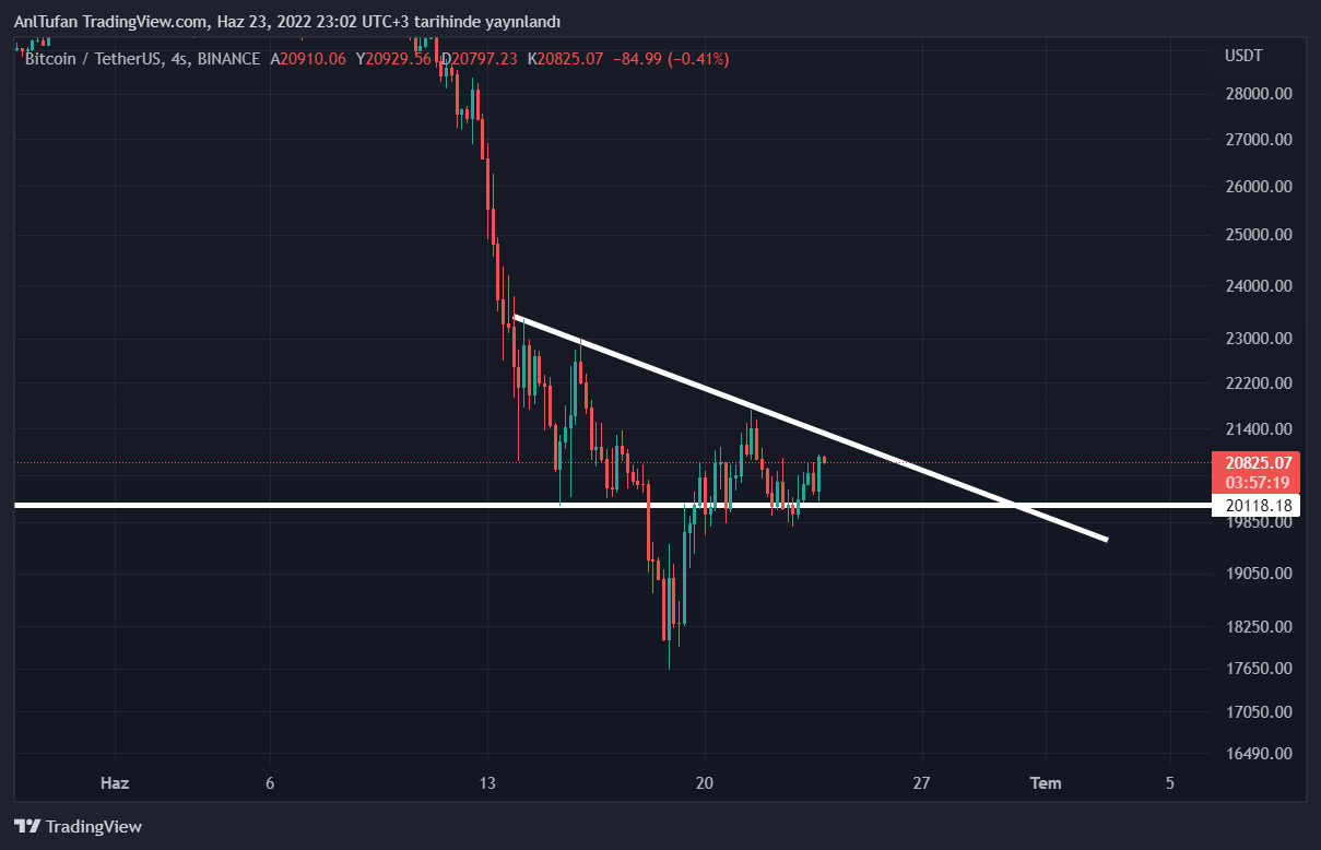 Haberimizin yazıldığı esnada 21 bin dolara yakın bir konumdan işlem gören lider kripto para birimi, 4 saatlik grafik üzerindeki Ters Omuz Baş Omuz (TOBO) formasyonunu halen kıramadı.