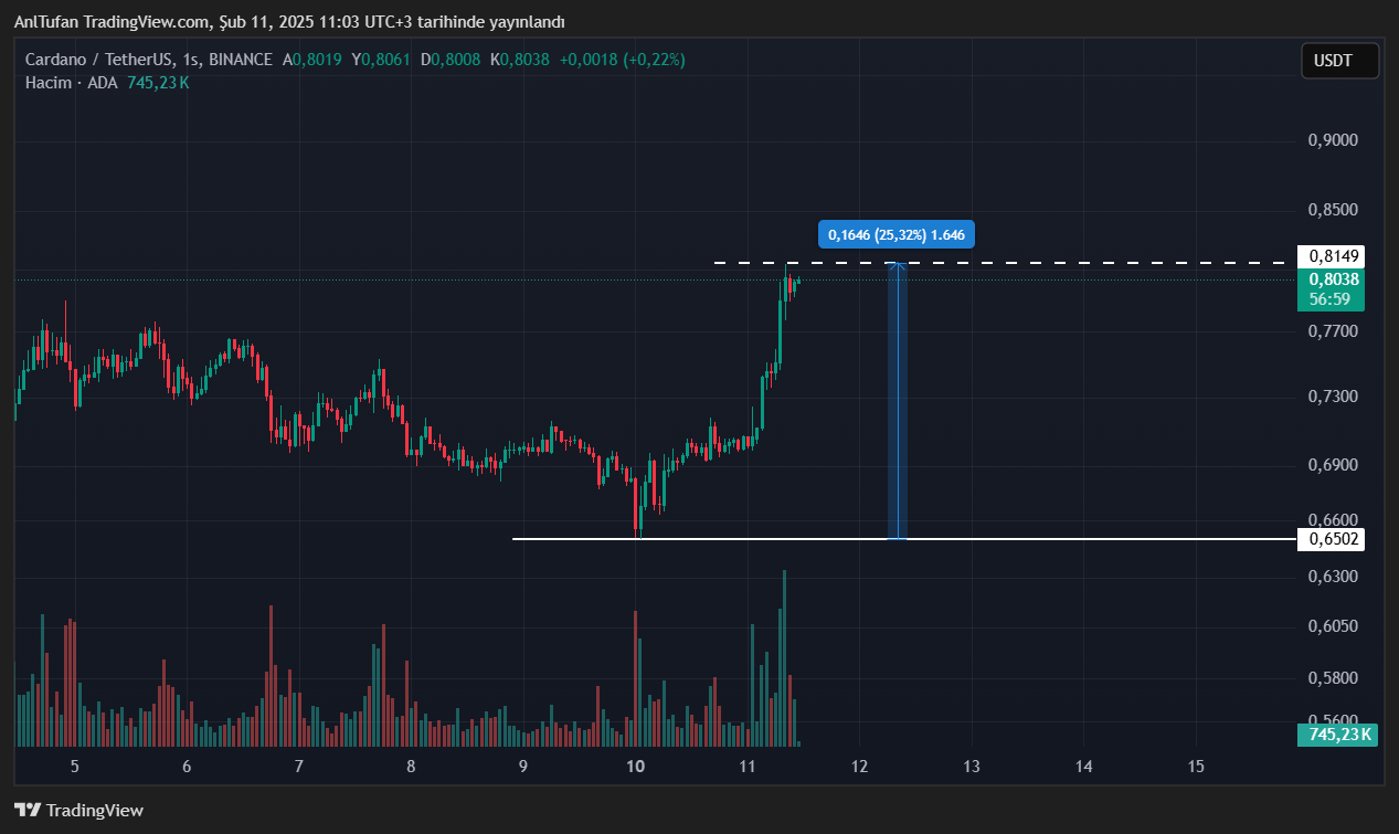 Bu gelen haberler ile birlikte Cardano’nun (ADA) bir yükseliş trendine girdiği görüldü. Dün gece özelinde 0.65 dolar seviyelerinde dip yapmayı başaran ADA, çok kısa bir süre içerisinde 0.815 dolar seviyelerine kadar yükseldi.