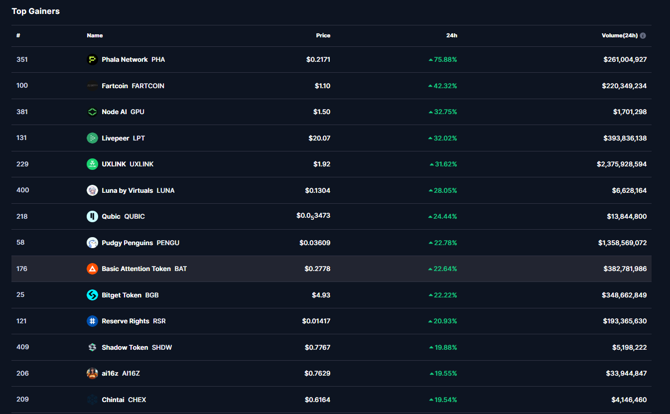 Başarılı veri sağlayıcısı CoinMarketCap’in aktardıklarına göre ilk 500 kripto para birimi içerisinde son 24 saat özelinde en çok artışı %75 ile birlikte PHA isimli altcoin gerçekleştirdi.