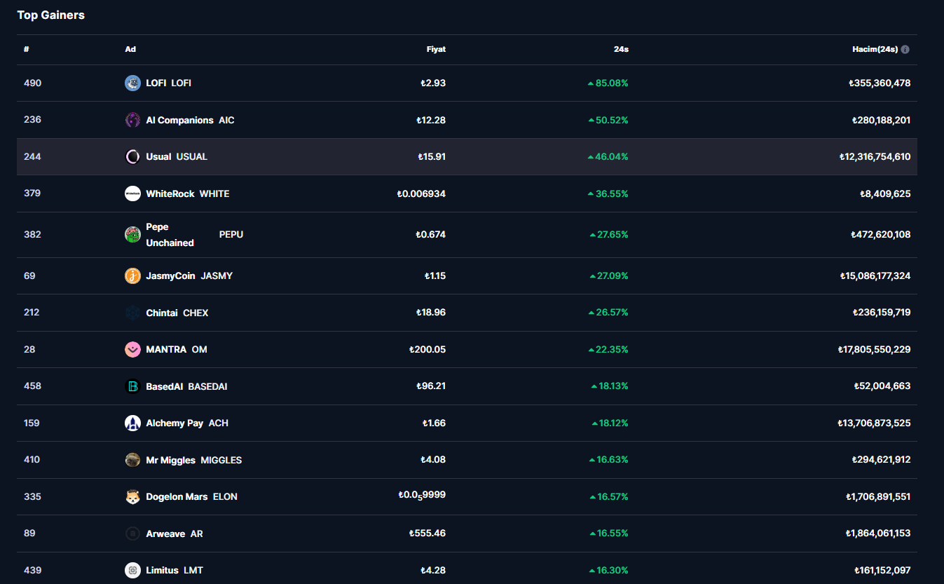 LOFI’nin yanı sıra AIC, USUAL, WHITE, PEPU, JASMY, CHEX ve OM’un da %20’den fazla değer kazandığı gözlemlendi.
