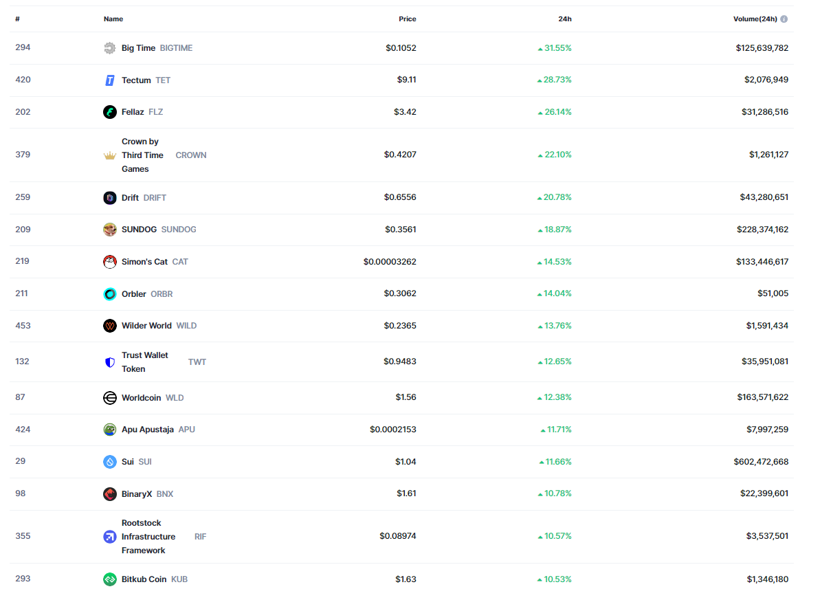 Başarılı veri sağlayıcısı CoinMarketCap’in aktardığı bilgilere göre son 24 saat özelinde ilk 500 kripto para birimi içerisinde en çok yükselişi %31 ile birlikte BIGTIME isimli altcoin gerçekleştirdi.