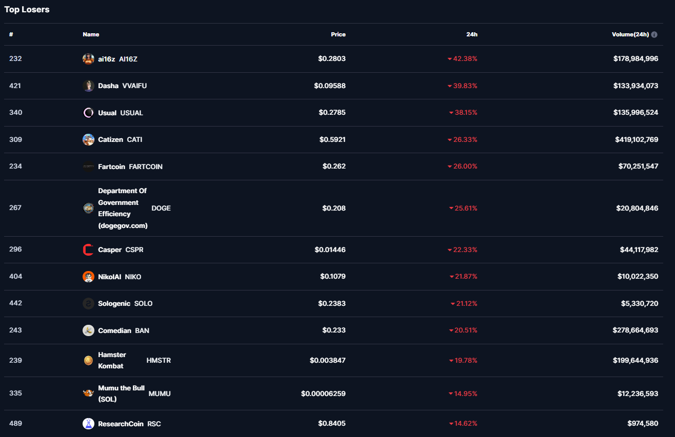Başarılı veri sağlayıcısı CoinMarketCap’in aktardıklarına göre ilk 500 kripto para birimi içerisinde son 24 saat özelinde en çok düşüşü %42 ile birlikte AI16Z isimli altcoin gerçekleştirdi.