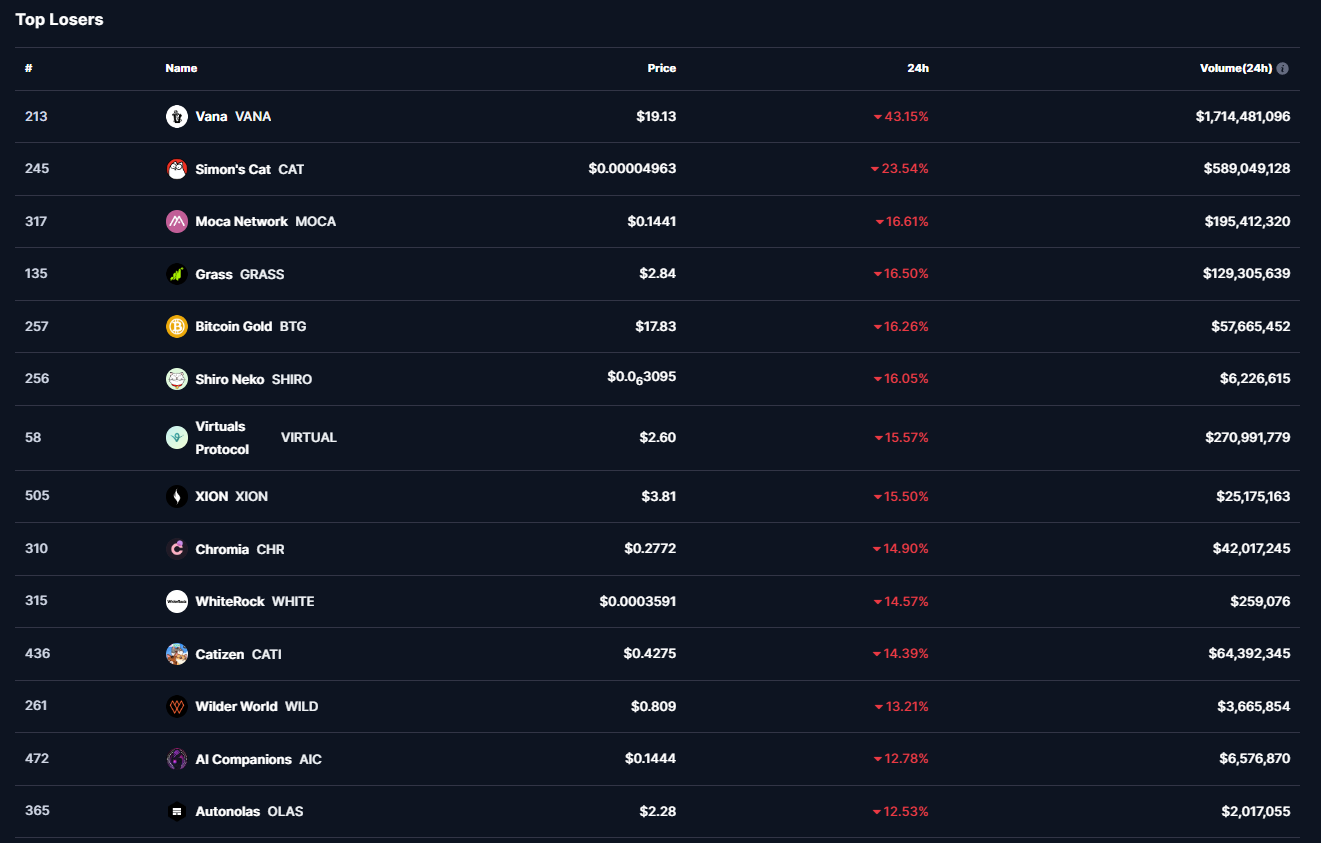 Başarılı veri sağlayıcısı CoinMarketCap’in aktardıklarına göre ilk 500 kripto para birimi içerisinde son 24 saat özelinde en çok düşüşü %43 ile birlikte VANA isimli altcoin gerçekleştirdi.