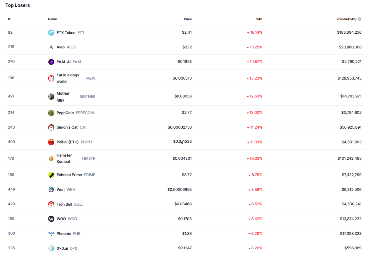 Başarılı veri sağlayıcısı CoinMarketCap’in aktardıklarına göre ilk 500 kripto para birimi içerisinde son 24 saat özelinde en çok düşüşü %18 ile birlikte FTT isimli altcoin gerçekleştirdi.