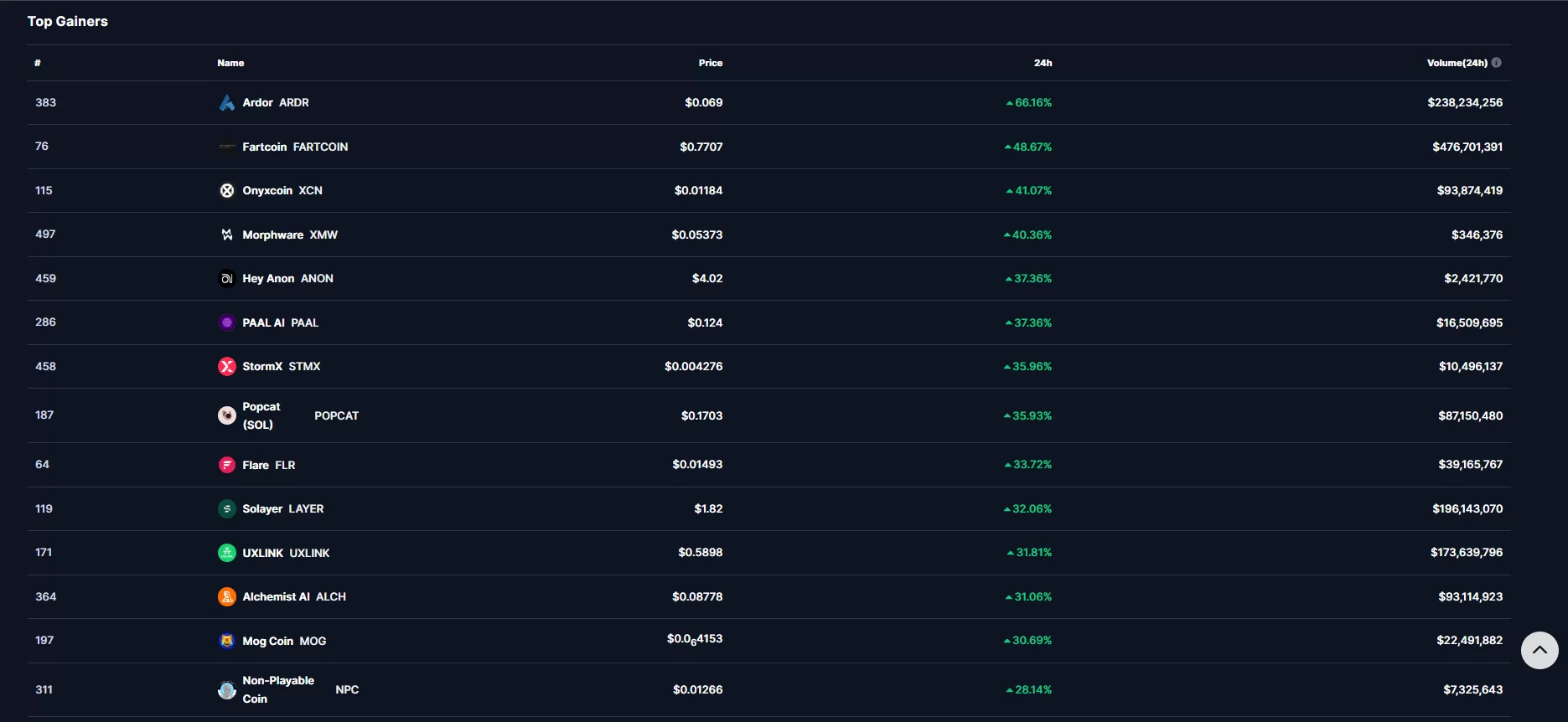 Başarılı veri sağlayıcısı CoinMarketCap’in aktardıklarına göre ilk 500 kripto para birimi içerisinde son 24 saat özelinde en çok artışı %66 ile birlikte ARDR isimli altcoin gerçekleştirdi.