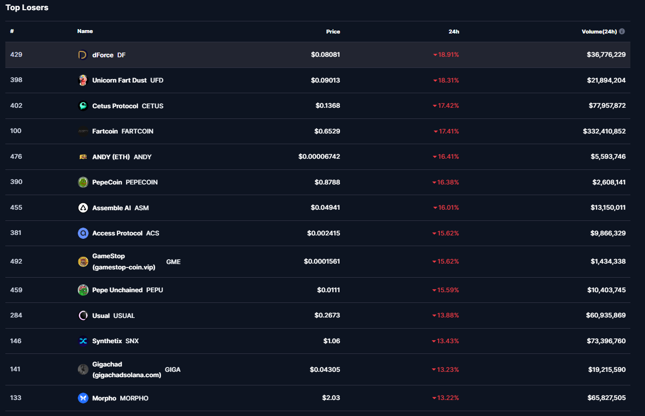 DF’nin yanı sıra UFD, CETUS, FARTCOIN, ANDY, PEPECOIN, ASM, ACS, GME ve PEPU‘nun da bugün özelinde %15’den fazla değer kaybettiği görüldü.