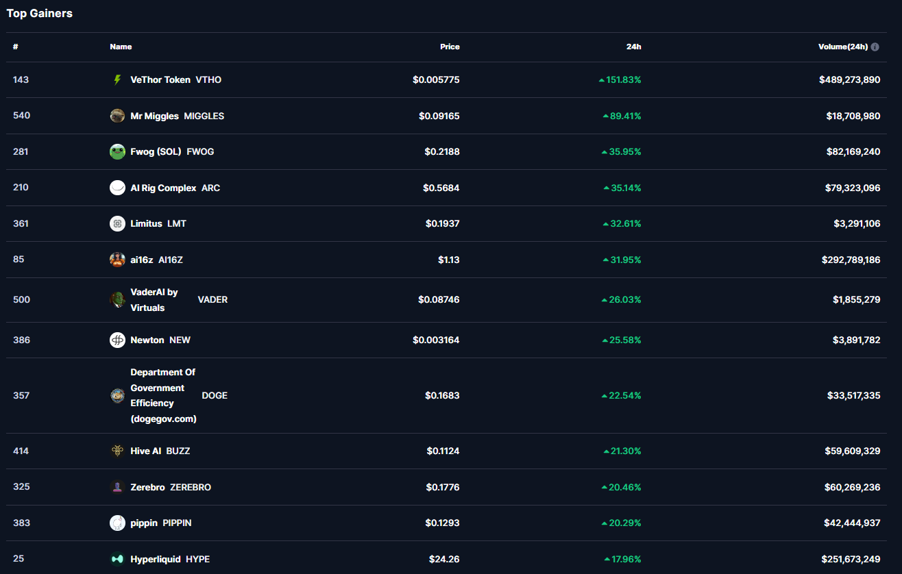 Upbit listelemesi ile sert yükselen VTHO’nun yanı sıra MIGGLES, FWOG, ARC, LMT ve AI16Z‘nin de %30’dan fazla değer kazandığı görüldü.