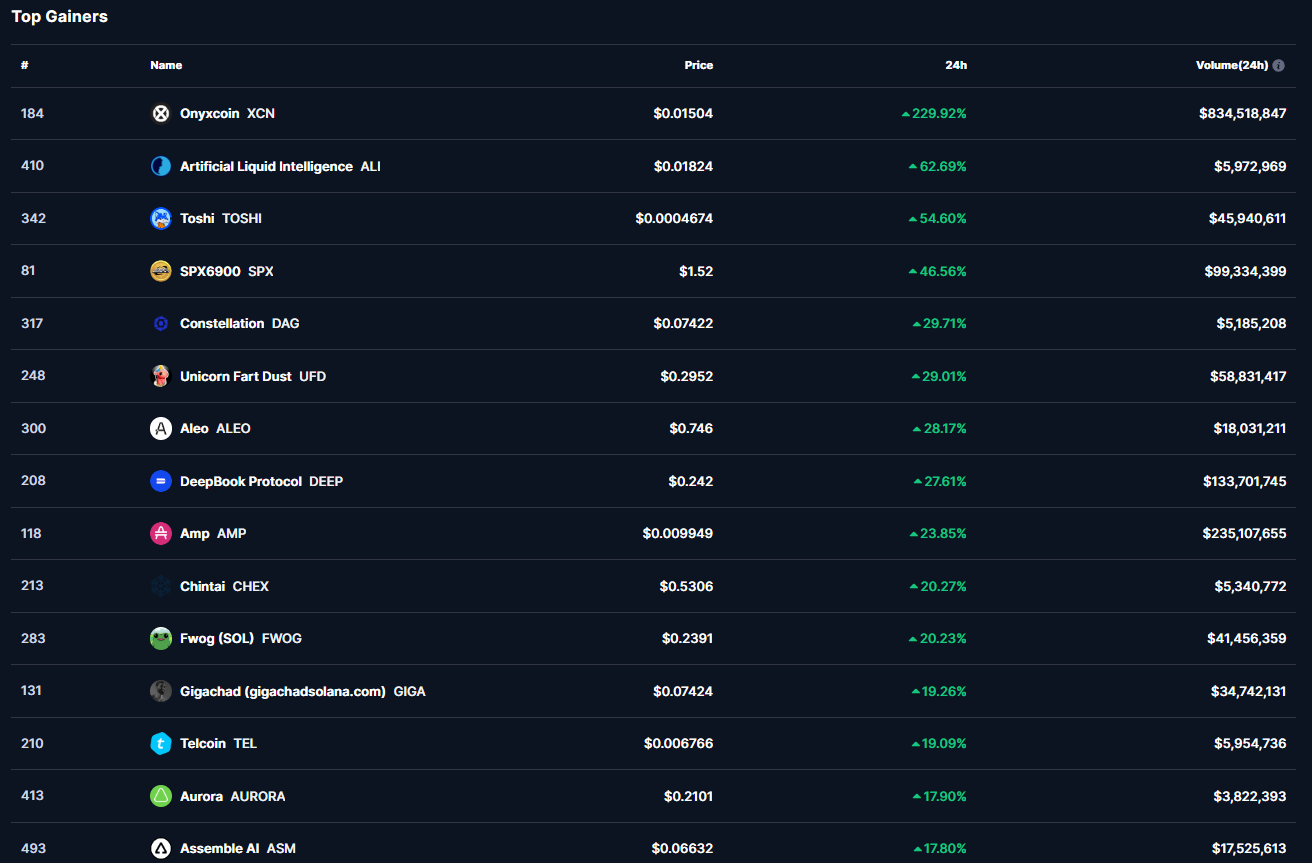 Başarılı veri sağlayıcısı CoinMarketCap’in aktardığı bilgilere göre son 24 saat özelinde ilk 500 kripto para birimi içerisinde en çok yükselişi %229 ile birlikte XCN isimli altcoin gerçekleştirdi.