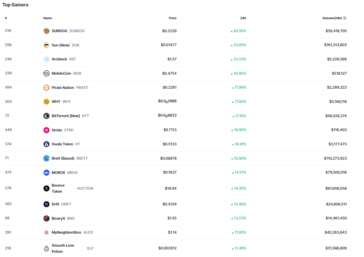 SUNDOG’un yanı sıra SUN isimli altcoin’in de %30’dan fazla değer kazandığı görüldü. Ayrıca, ABT, MOB, PIRATE, WHY, BTT, STRD, HT ve BRETT‘de %15’den fazla yükseliş gerçekleştirdi.