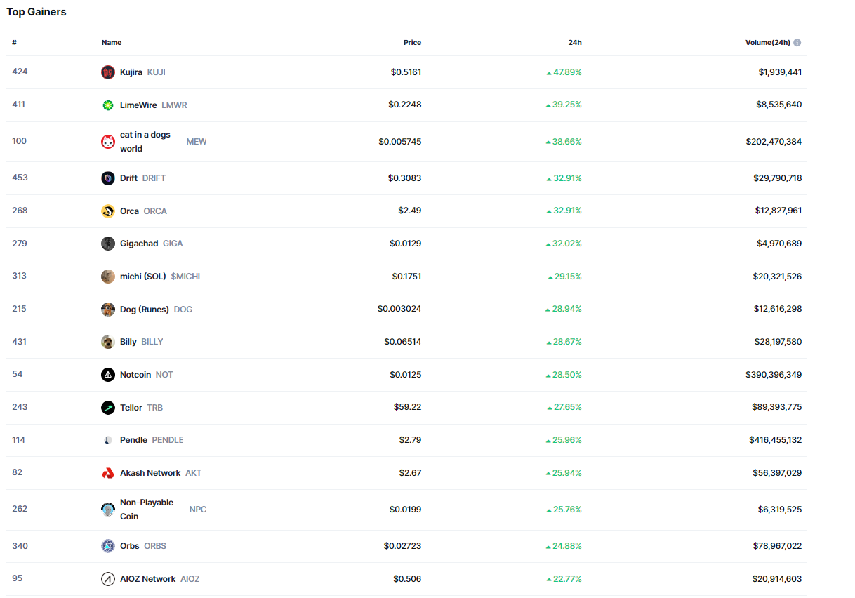 Başarılı veri sağlayıcısı CoinMarketCap’in aktardığı bilgilere göre son 24 saat özelinde ilk 500 kripto para birimi içerisinde en çok yükselişi %48 ile birlikte KUJI isimli altcoin gerçekleştirdi.