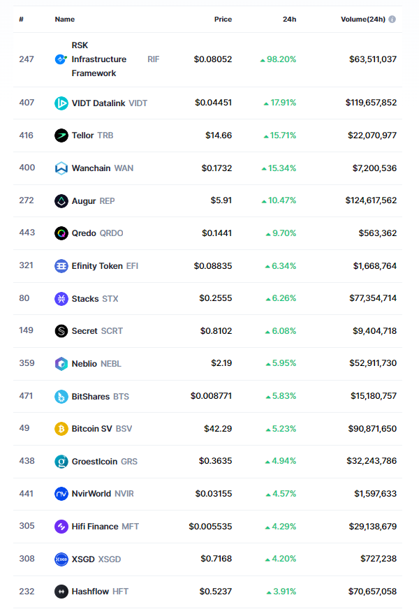 Binance borsasının alt şirketlerinden bir tanesi olan CoinMarketCap’in aktardıklarına göre, bugün itibariyle en fazla yükselişi RIF isimli altcoin gerçekleştirdi.
