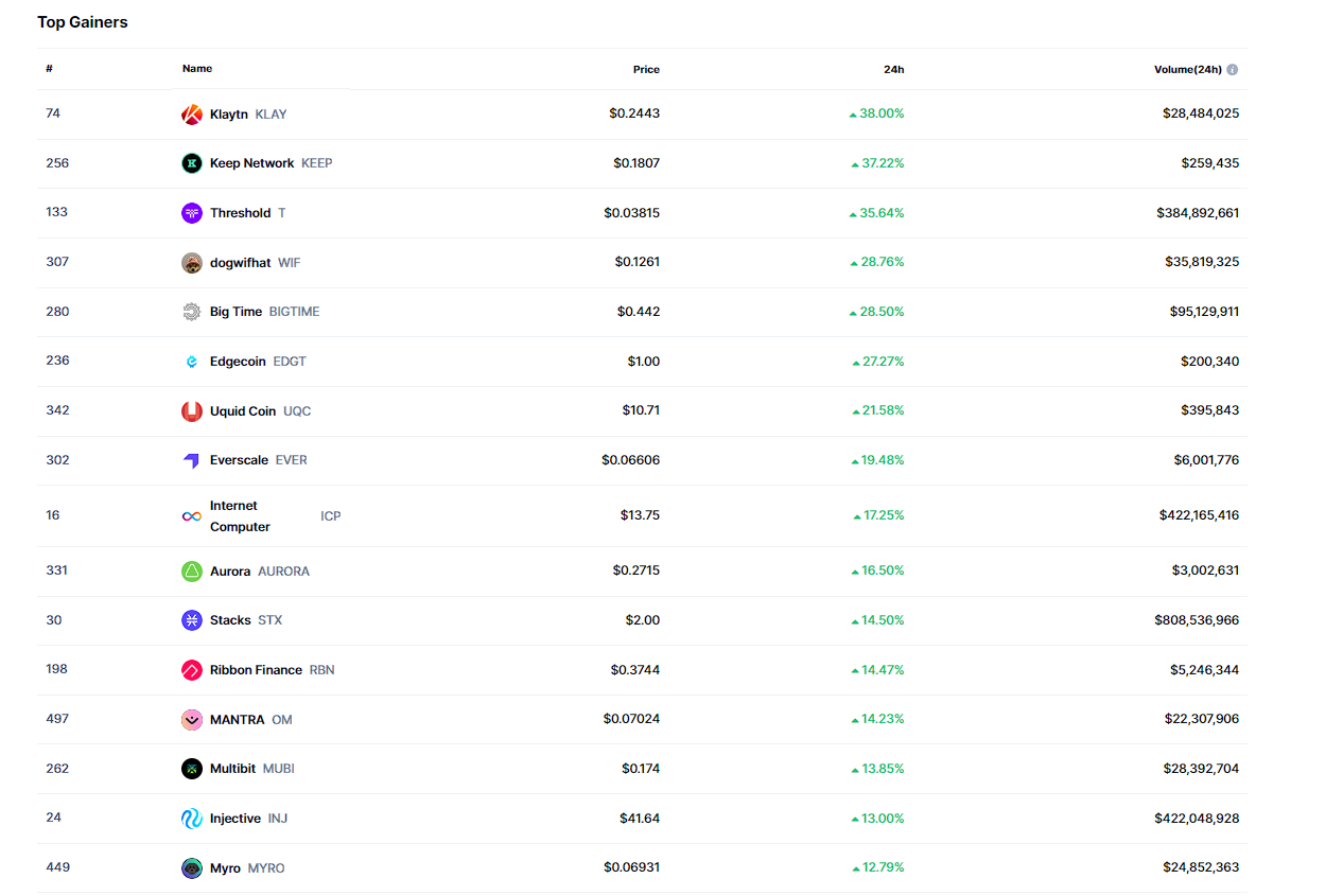 KLAY son 24 saat içerisinde %38’lik bir artış yaşarken, sırasıyla KEEP, T, WIF, BIGTIME ve EDGT‘de %25’den fazla değer kazanmayı başardı.