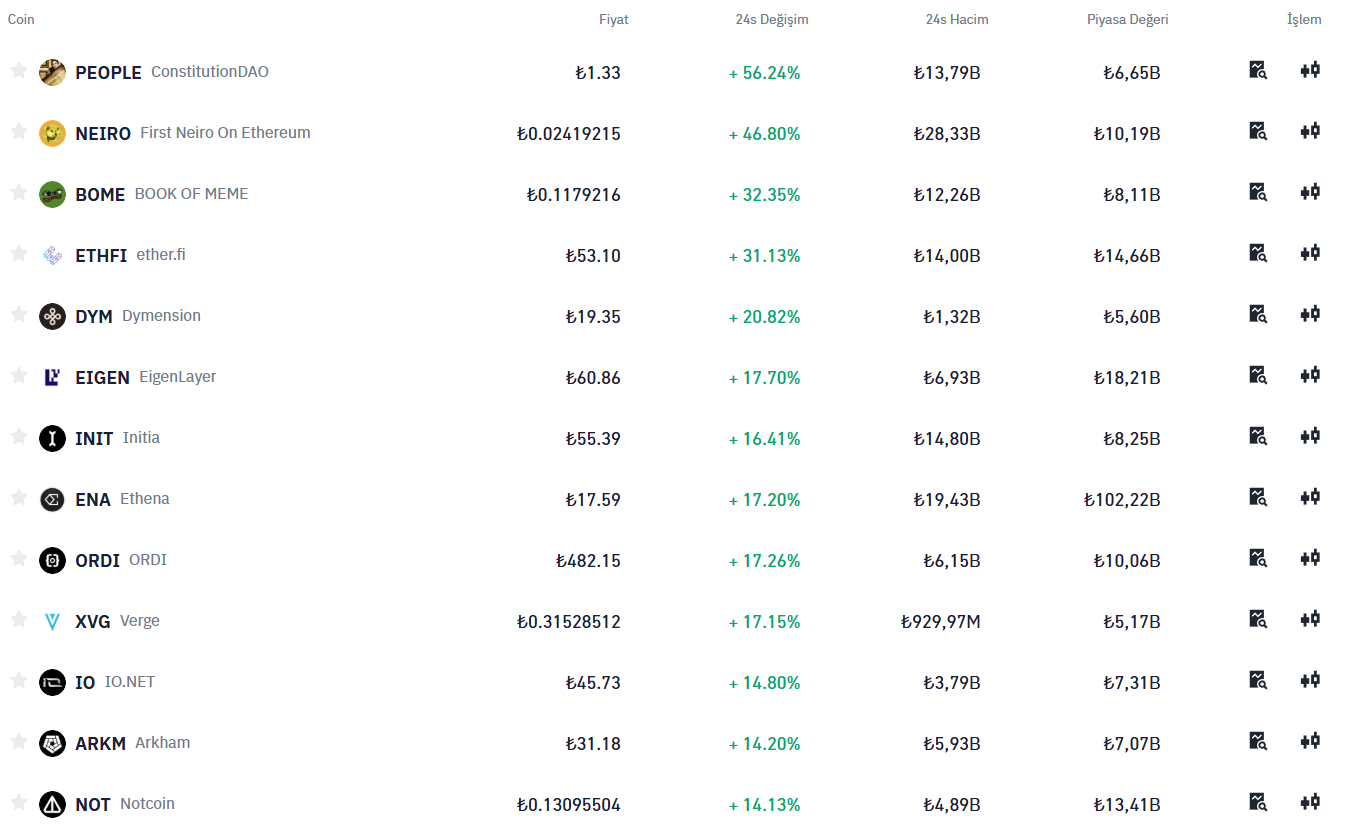 PEOPLE’daki bu sıçramanın yanı sıra NEIRO, BOME, ETHFI, DYM, EIGEN ve ENA‘nın da günün en çok kazandıranları listesinin üst sıralarında yer aldığı görüldü.