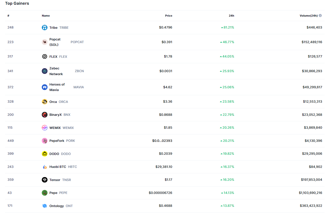 TRIBE’nin ardından sırasıyla POPCAT, FLEX, ZBCN, MAVIA ve ORCA gibi altcoin’lerin de bugün özelinde kayda değer yükselişler yaşadığı gözlemlendi.
