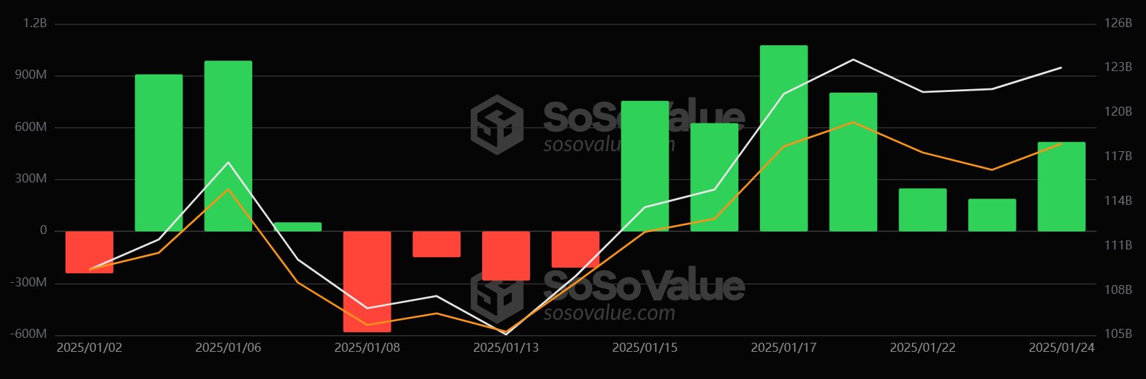 24 Ocak’ta Bitcoin spot ETF’nin toplam net girişi 518 milyon dolardı ve 7 gün üst üste net giriş oldu.
