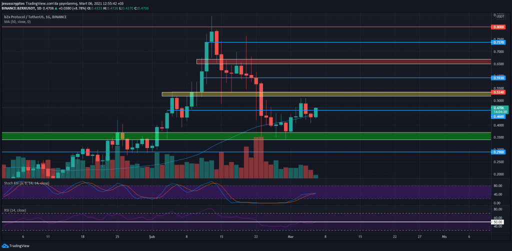 Günlük grafikte önemli bir destek alanı olan 0.34 – 0.37 dolar aralığına ziyaretinin ardından yükselişi yakalayan BZRX, 0.46 dolarlık direnç üzerine çıkmayı başardı. BZRX’in önümüzdeki günlerde bu seviye üstündeki kapanışları, önemli bir direnç alanı olan 0.518 – 0.534 dolar aralığına kadar yükseliş sağlayabilir.