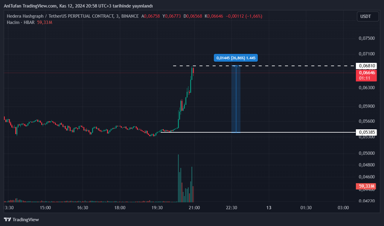 Bu gelişme ile birlikte Binance‘de listelenmiş bir altcoin olan HBAR çok sert bir yükseliş gerçekleştirdi. Birçok altcoin düşerken dakikalar içerisinde %26 oranında değer kazanan HBAR, dikkatleri üzerine çekti.