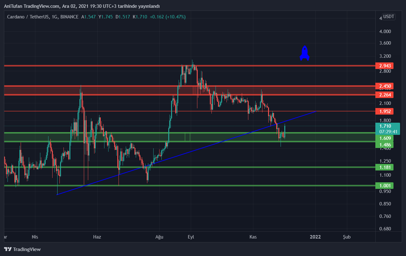 Aşağıdaki grafikte belirttiğimiz gibi net bir trend çizgisi bulunan ADA’nın bu trend seviyesinden bir direnç görmesi bekleniyor. İlerleyen süreç içerisinde, bu çizgilere dokunması durumunda 1.81 dolar seviyelerine denk gelen trend çizgisi direnç görevini üstlenecek.